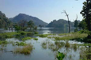 Buduruwagala liegt knapp 30 km südlich von Ella zu Füßen des Hochlands, ist selbst aber schon Teil des Tieflands. Die Umgebung zeigt die Buschvegetation der Trockenzone. Und der Felsen von Buduruwagala ist einer der typischen Granitrücken, auf die man in allen Tiefland-Regionen der Insel stößt. Er zeichnet sich nicht durch seine Höhe aus, sondern durch seine senkrechte Flanke. Mit etwas Phantasie zeigen deren Umrisse die Gestalt eines knienden Elefanten, der seinen Rüssel zum Mund dreht. Man erreicht den Ort nur über eine holprige Stichstraße, die 5 km südlich von Wellawaya von der Hauptstraße A2 nach Süden in westlicher Richtung abzweigt. An der Kreuzung befindet sich ein kleines Museum für antike buddhistische Kunst. Der unasphaltierte Weg, der hier beginnt, ist nach starken Regenfällen für nicht geländegängige Fahrzeuge kaum mehr befahrbar. Die Stichstraße führt an dem seit einigen Jahrzehnten restaurierten Stauteich Buduruwagala-Wewa entlang (Foto).