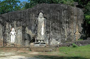 Die Dreier-Gruppe (siehe Hauptfoto oben), die den zentralen großen Budhha zu seiner Rechten flankiert, zeigt ihrerseits eine prägnante Mittelfigur, die etwas größer ist als ihre beiden Begleiter, sie erreicht noch 7m Höhe. Heute ist sie um so auffälliger, als sie als einzige ganz geglättet ist und noch ihren weißen Putz trägt. Zudem ist ihr Haupt von einer orangefarbenen Gloriole umgeben, die ein Hinweis auf die ursprüngliche Bemalung aller Statuen sein kann. Die Augen der Skulptur sind ungewöhnlich klein. Diese weiße Gestalt fällt - wie alle fünf weiteren – sehr aus dem Rahmen der theravadabuddhistischen Ikonographie Sri Lankas. Hüfte und Taille sind sehr betont gerundet. Sie trägt einen auffälligen Gürtel aus vielen parallelen Schnüren wie hinduistische Götterbilder oder indische Tempeltänzerinnen. Besonders markant ist hier die hohe Krone, ein typisches Attribut der Hindu-Gottheiten und mahayanabuddhistischer Heilsgestalten. In der Mitte dieser Krone kann man ein Relief erkennen, das einen meditierenden Buddha darstellt. Dies ist ikonographisch ein ziemlich sicheres Erkennungsmerkmal für Avalokiteshwara, den verehrtesten Bodhisattva im Mahayana-Buddhismus. Seine Handhaltung ist jedoch ikonographisch etwas ungewöhnlich, wenn man nach den indischen Vorbildern fragt. Alle Finger der erhobenen Hand sind gekrümmt, die mittleren stärker als die äußeren. Es handelt sich um eine Handstellung namens Katakahasta, auch Katakamukham-Hasta genannt. Wörtlich heißt das „Krebshand“.