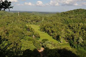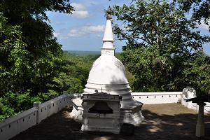 Der steilste Abschnitt der Treppe führt dann weiter auf die Felsenspitze. Oben hat man dann 533 Stufen erklommen. Hier sieht man einen neuen Baumtempel und einen strahlend weißen Stupa auf der Spitze. Doch beeindruckender sind die Aussichtspunkte in alle Richtungen (Foto). Bei klarem Wetter kann man im Süden das Meer und im Norden die Berge des Singharaja-Regenwaldes erkennen. Von hier oben aus betrachtet wirkt der tiefe Süden Sri Lankas wie ein menschenleerer Wald. Ein Felsloch stellt eine direkte Verbindung zum Abhang her, es soll von einer mythischen Schlange geschlagen worden sein.