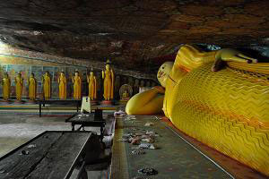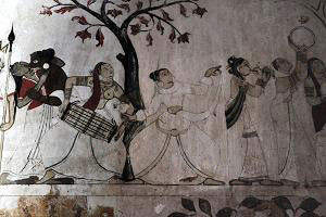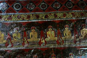 Künstlerisch gelungener sind die originalen Kandy-Malereien neben dem Eingang zur größten Höhle mit dem liegenden Buddha. An der Außenwand sieht man Szenen des Jivi-Jataka. Sie gehören zu den bekanntesten Malereien des Südens Sri Lankas, vor allem die Gruppe von Musikern, bei der erstmals in der Kunst Sri Lankas eine Frau als Trommlerin abgebildet ist (Foto). Diese Malereien sind wie gesagt noch aus der Kandy-Zeit. Sie sind seitdem nicht einmal restauriert worden. Trotzdem wirken sie wie neu. Es mögen Illustrationen von Texten aus dem buddhistischen Kanon sein, aber Kleidung und Gebräuche geben einen Eindruck von der höfischen Kultur im Kandy des 18. Jahrhunderts.