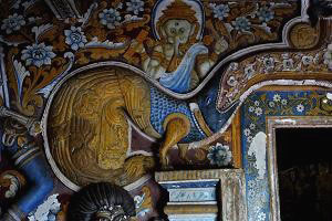 Am interessantesten sind in dieser "Etage" des Klosterfelsens weniger die Höhlenräume selbst als der Gang davor. Man sieht an den Durchgangstoren in die hintere große Höhle neuere Darstellungen von Makaras (Foto), an denen man unterschiedliche Tiere erkennen kann, die zu diesem Phantasiewesen kombiniert wurden: Makaras sind mythische Seemonster. Man nennt sie auch manchmal Meereselefanten, da sie den Kopf eines Elefanten und den Leib eines Fisches haben. Ein Makara ist ein Symbol für die Kräfte des Wassers, sowohl die lebensspendenden als auch die verheerenden. Auch in der Hindu-Kunst trifft man häufig auf dieses Motiv, das oft auch als ein Krokodil interpretiert wird. An den bunten Makaras hier in Mulkirigala erkennt man das Krokodil am Maul, doch es läuft aus in einen Elefantenrüssel. Der Körper ist der eines schuppigen Fisches, das Ohr das eines Schweines, die Pranken die eines Löwen und der Schwanz der eines Vogels.