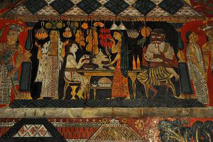 Auch die zweite Höhle nebenan beherbergt einen etwa gleich großen liegenden Buddha. Die Höhlendecke ist ganz konventionell mit Blumen bemalt. Die Wand zwischen den Türen zeigt hier Jataka-Szenen, wie sie für die Kandy-Malerei typisch sind. In horizontalen Linien werden wie in einem Bilderbuch die Szenen aneinandergereiht. Die Bilder mögen nach europäischen Maßstäben wenig Tiefenperspektive aufweisen. Aber im Vergleich mit der klassischen Kandy-Malerei z.B. von Degaldoruwa zeigt sich doch eine ausgeprägtere Räumlichkeit. So überschneiden sich die Figuren häufiger. Und auch Schattierungen kommen zum Einsatz. In der linken Hälfte der Wand sieht man die Erzählung des Telapatta-Jataka (Foto), die Ölschüssel-Geschichte, rechts die des sehr populären Vessantara-Jataka, das davon berichtet, wie der Buddha in einem früheren Leben alles Hab und Gut, alles Prestige, seine Kinder und am Ende seine geliebte Frau für andere hingegeben hat, als die Götter seine Großzügigkeit auf die Probe stellten.