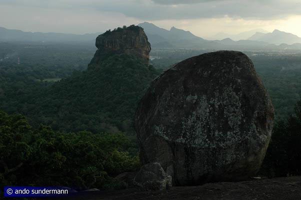 Das Foto zeigt Sri Lankas wahrscheinlich bekannteste, interessanteste und schönste Attraktion, den "Löwenfelsen" Sigiriya, Teil des Weltkulturerbes - allerdings aus einer ungewohnten Perspektive, nämlich von dem Nachbarfelsen Pidurangala. Zu jener kurzen Zeit, als die Festungs- und Gartenstadt Sigiriya bewohnt war, diente Pidurangala vor den Stadtmauern als Kloster, angelegt von dem Erbauer Sigiriyas. Sigiriyas berühmte Wolkenmädchen stellen wahrscheinlich eine Prozession nach Pidurangala dar. Trotz der Nähe von nur drei Kilometern zum Touristenmagneten Sigiriya und obwohl es selbst über eine sehenswerte Fels-Figur eines Liegenden Buddha verfügt, ist Pidurangala fast immer ein menschenleerer Ort. Der Stufenweg auf den Felsen führt durch einen wildromantischen Dschungel. Auf dem Felsplateau kann man mitten im Kulturdreieck die allergrößte Stille genießen. Es ist einer der beeindruckendsten Punkte der Insel überhaupt, ein Beispiel für die vielen Punkte, die Busreisegruppen meist links liegen lassen und die gerade darum die nachhaltigsten Eindrücke von der traditionsreichen Tropeninsel bieten - so man sich denn die Zeit nimmt und die Mühe macht, sie aufzusuchen. Es sind solche Orte wie Pidurangala, die den Charme Sri Lankas erst erschließen.