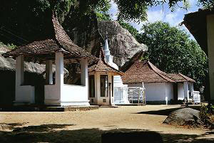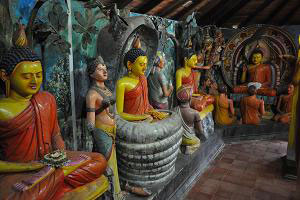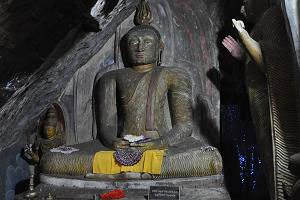 Den Abschluss der Höhle bildet in einer Art Felskapelle eine große Sitzfigur des Buddha (Foto) in der üblichen Samadhi-Mudra, der sehr verbreiteten Geste der Meditation, flankiert von einem Stehenden Buddha, der die Hände segnend erhebt. Die Sitzfigur könnte noch älter sein als die Kandyzeit, da sie nicht die übliche Lack-artige Bemalung des Kandystils aufweist, für die auf der Statue erst eine Grundierung über einem Textilüberzug gelegt wurde. Die gelben Farbreste, die man heute an der Felsfigur sieht, dürften indes von sehr viel späteren Restaurierungen herrühren. Blumenschmuck und andere Gaben zeugen davon, dass Dorfbewohner und Pilger die Kulthöhle weiterhin aufsuchen, um hier ihren Bräuchen gemäß unblutige Opfer zu bringen.