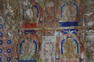 Man blickt dann vor einen herabhängenden Teil des Felsens, der leuchtend blau angemalt ist und große gelbe Kreise als Symbole für Sonne und Mond zeigt. Dieser Teil der Felsfresken mit auffallend kräftigen Farben stammt angeblich aus der jüngeren Kandy-Zeit, wahrscheinlich aber erst aus der Kolonialzeit. Die im Dämmerlicht der Höhle zunächst kaum zu erkennenden Malerein dahinter sind originale Kandy-Malereien (Foto). Ocker-Töne herrschen vor, auch die für Kandy-Malereien untypische blaue Farbe ist aber deutlich zu erkennen. Nach hinten wird die Höhle wieder etwas breiter.