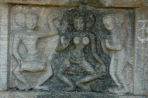 Klassisch singhalesisch ist das Relief-Motiv über den beiden seitlichen Fenstern des Torpavillons, der von Elefanten gebadeten Göttin Lakhshmi (Foto), noch dazu eingerahmt von den Bögen der Makara-Toranas, die an keinem Tempel Sri Lankas fehlen. Die erquickte "Gajalakhshmi" ist seit den Anfängen der buddhistischen Kunst ein Symbol für die freudvolle Geburt des Buddha. Hier in diesem Tympanon in Yapahuwa ist sie zusätzlich eingerahmt von Bändern von Tieren und Rankenwerk, fast an einen Mondstein erinnernd.